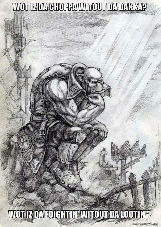 Для некоторых зеленокожих светлая радость сражения сравнима с удовольствием от скорости или лутинга. Но ведь ничего не мешает это совмещать? Некоторые орки настолько любят скорость, что становятся одержимы ею. Такие, даже среди орков, считаются слегка странными. За глаза их называют “скородурками”, или спидфриками, на низком готике. Такие орки часто объединяются в отдельные ватаги, называемые “Культом скорости”.