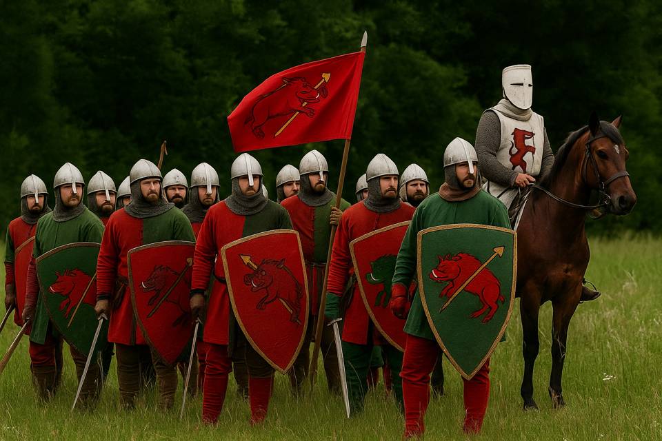 Во главе – сам Бертран Ветвистый: огромный, бородатый, с руками, как мотыги. За ним – колонны пехотинцев. Щиты, у многих – на всех вепрь, пронзённый копьём, на зелёном поле. Почти у всех – железные шлемы, даже с наносниками. Все в шерстяных накидках родовых цветов; что под ними – кольчуги или стёганка – не разобрать. Сначала я напрягся – не видно копий. Но потом увидел их в повозках. Маделар не солгали – всё по-честному. Не меньше пяти сотен пехотинцев. Обозные слуги в простой одежде – ещё не меньше пары сотен. Почти у всех при себе дубины, топоры, грубые ножи. Они в счёт не входили.