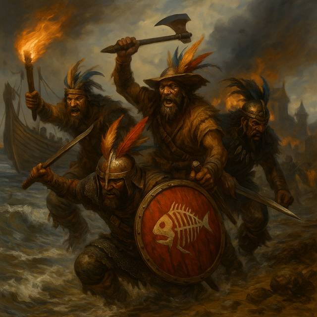 – Да там сотня шнеков, десяток коггов, и… – он замялся. – Несколько очень быстрых кавалерийских отрядов. Пеших не меньше тысячи бойцов, возможно полторы. Хорошо вооружены: кольчуги, щиты, у некоторых панцири из бронзы, даже из кости. И шлемы – как звериные черепа, с рогами, перьями. Идут нагло. И очень быстро.