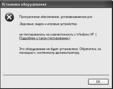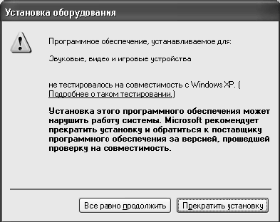Для уменьшения риска повреждения системных файлов в результате установки неподписанных драйверов операционная система, при настройках по умолчанию, приостанавливает установку и сообщает о потенциальной опасности. В окне Установка оборудования появляется предупреждение о том, что устанавливаемый драйвер не тестировался на совместимость с Windows ХР Professional. Предлагается либо прекратить установку, либо продолжить ее несмотря ни на что (рис. 2.4).