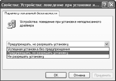Чтобы запустить консоль управления локальной политикой безопасности, зайдите в Панель управления, там выберите Администрирование и далее Локальная политика безопасности. В открывшейся консоли выберите Локальные политики, Параметры безопасности и двойным щелчком по элементу Устройства: поведение при установке неподписанного драйвера откройте окно выбора параметров политики безопасности (рис. 2.7).