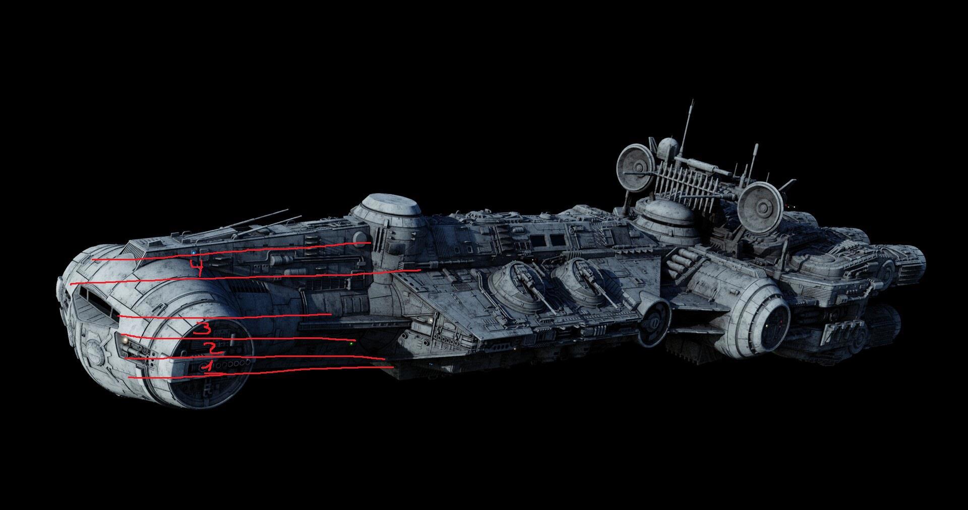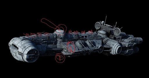 Так же в носу «головы» под самой рубкой управления, где у обычного CR90 были установлены аварийные воздушные шлюзы для стыковки, будут находиться спасательные капсулы, которые будут замаскированы под эти самые шлюзы.