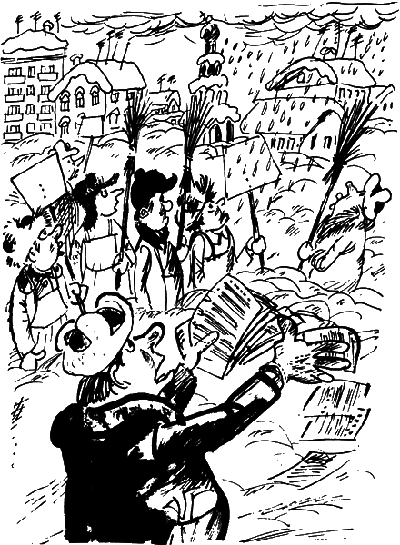 И закипела работа. Администраторы не знали усталости. Ежедневно и ежечасно проводились собрания, заседания, симпозиумы, слеты, съезды. Только в первом квартале в общей сложности было произнесено 286 725 докладов, речей и выступлений в прениях по вопросам преодоления зимних трудностей. На изготовление лозунгов и транспарантов, призывающих бороться со снегом, израсходовано 16 323 кв. м высококачественных хлопчатобумажных тканей и 105 кг цинковых белил. По проблематике «Снегопад 10 января и его влияние на инфраструктуру Обрадовска» защищено 17 кандидатских и 4 докторские диссертации.