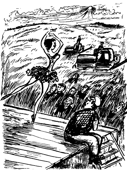 Итак, в течение 48 часов на сцене, сооруженной среди разлива янтарной пшеницы «безостая-1», сменяя друг друга, показывали свое искрометное искусство народные театры драмы, комедии, оперы и балета, оперетты и пантомимы при городском Дворце культуры работников управления; многоголосый сводный хор сотрудников административно-хозяйственного аппарата районных организаций и учреждений, вокально-инструментальный ансамбль «Задорные балбесы». Так как комбайнеры по известной причине не смогли завести свои машины, то ни одного колоска сжать не удалось, и в качестве первого снопа фигурировал муляж, искусно выполненный в свободное рабочее время умельцами второго вычислительного центра городского треста по приему стеклянной посуды у населения.