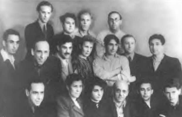 Под крылом «Комсомолки». Верхний ряд слева направо: Максим Джежора, Евгений Винокуров, Владимир Солоухин, А. Храбровицкий. Второй ряд: Владлен Бахнов, Р. Я. Плятт, Н. Гребнев, (?) В. Гончаров, В. С. Сидорин, Р. Гамзатов. Нижний ряд: (?), Елена Николаевская, (?), Н. Антокольский, Г. Поженян, И. Кобзев. 1948 г.