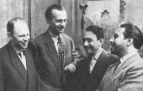 Шутя и играя, сдружились всерьез. Слева направо: Я. Костюковский, Ю. Тимошенко (Тарапунька), В. Бахнов, Е. Березин (Штепсель)