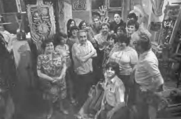 Застолье в Подвале – чем бог послал. В центре – Вадим Сидyp, слева – Юля Сидур, жена художника, справа – сын, Миша Сидур