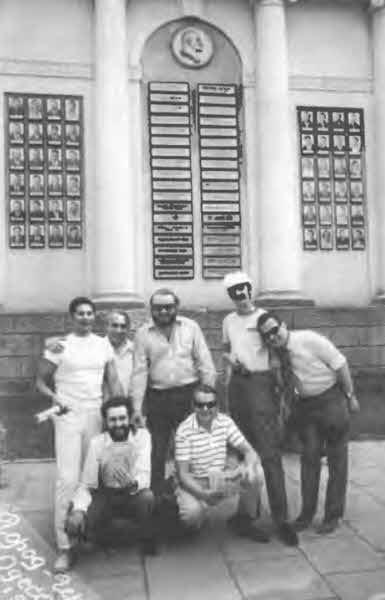 Веселая команда клуба «12 стульев» развозит сатиру и юмор по стране (без стульев). Слева направо: сидят В Владин, В. Резников, стоят: В. Бахчанян, В. Бахнов, В. Веселовский, А. Иванов, И. Суслов