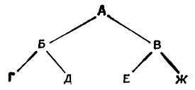 В этом случае отношения, связывающие лидера А с членом Г (или А с Ж), возможны только через Б (или В). Организация строится на отношениях А – Б, А – В, Б – Г, Б – Д, В – Е и В – Ж.