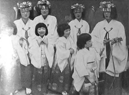 Девушки в одежде синтоистских жриц мико перед исполнением ритуального танца «Ураясу-но маи».