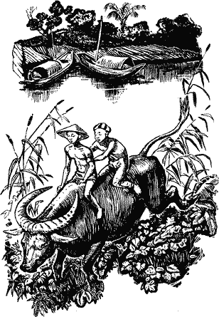 Наша буйволица Бинь была поручена моим заботам. Теперь ее пасти было труднее, чем прежде. После того как мой отец ушел в армию, выводить Бинь на пахоту стало некому, и буйволица, не чувствуя над собой строгой хозяйской руки, совсем разбаловалась. Едва ее выпускали за ворота, как она норовила удрать к реке и подраться там с другими буйволами. Я велел Островитянину сплести из тутовника кнут, специально чтобы разгонять сцепившихся буйволов.