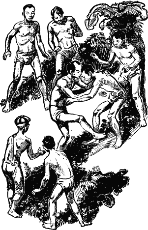 Островитянин бросился на выручку Бон Линю. Но в темноте ничего нельзя было разглядеть, поэтому он то бросался вперед, то отскакивал, боясь, что надает в темноте по ошибке тумаков Бон Линю. Тут мы услышали топот бегущих ног, и кто-то крикнул: