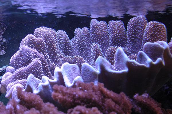 Прикрепившись, личинка превращается в маленького полипа, подошва которого тут же начинает формировать скелетную пластинку из углекислого кальция. Толщина пластинки постоянно растет, вверх от нее начинают подыматься скелетные перегородки, разделяющие тело полипа на несколько радиальных секторов. В результате зрелый организм выглядит как тонкая пленочка живой ткани, натянутая на мощный известковый скелет. Среди мадрепоровых кораллов есть и любители одинокой жизни, но подавляющее большинство их колониальные: они селятся вместе, сливаются воедино, образуя те причудливые формы, которые и вызывают наше восхищение. У одних видов они шарообразные, у других – напоминают кусты, у третьих – выглядят как плоские решетчатые плиты, у четвертых – это складчатые поверхности сложной формы, напоминающие не то некоторые наземные грибы, не то абстрактные скульптуры. Есть виды, колонии которых похожи на кочан цветной капусты или человеческий мозг, разделенный длинными извилистыми бороздами. Если приглядеться к такой борозде, то можно заметить, что по ее центру проходит сплошная щель – линия слившихся воедино ртов отдельных полипов, вдоль которой рядами сидят щупальца. У мозговиков (так называют эти кораллы) процесс объединения захватил не только скелеты, но и сами тела полипов. Выделить внутри такой колонии отдельных особей невозможно – она вся представляет единый организм.