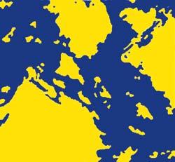 Компьютерная модель вечной инфляции. Ложный вакуум (желтый) расширяется вдвое каждые 10-33 секунд. В областях, где он распался (синие), образовались вселенные, подобные нашей. На границах происходит «большой взрыв».