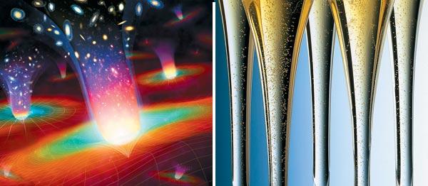 С появлением теории инфляции Большой взрыв перестал быть единственным уникальным событием. Согласно ей вселенные возникают и расширяются, как пузырьки в бокале шампанского. И таких «бокалов» может быть множество. Фото слева: SPL/EAST NEWS, справа: FOODFOLIO/EAST NEWS