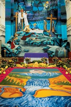 Начинается все с того, что за несколько дней до начала той или иной пасхальной процессии «чествуемую» статую наряжают и помещают в алтарную часть храма (обычно это Jesu´s Nazareno – Иисус, несущий крест, Señor Sepultado – Господь, снятый с креста, или Virgen de Dolores – Дева Мария Скорбей Наших). Часто вокруг изваяния строят огромные «декорации» из цветной бумаги с изображением библейских сцен и антуража. Впереди расстилаются великолепные ковры. Причем речь здесь идет вовсе не об изделиях текстильной промышленности: пасхальные ковры в церквях и на мостовых Антигуа «сотканы» из живых цветов, плодов, хвои, стекляруса, а их основу составляют цветные опилки и песок. Работа настолько тонкая, что издалека все это кажется картиной, написанной маслом. Особенно то, что создается к Страстной пятнице, Дню Распятия Христа. Вот когда улицы украшают самые роскошные покровы.