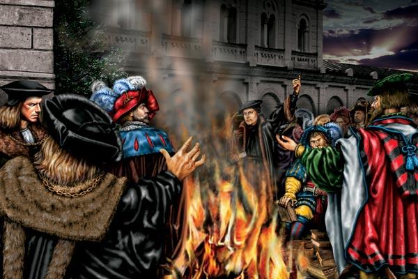 Когда в 1517 году отличавшийся крайним религиозным рвением католический монах из Тюрингии по имени Мартин Лютер впервые выступил против продажи индульгенций, он хотел только исправить и укрепить Вселенскую церковь, напомнить о евангельском идеале бедности, о чистоте ранней христианской общины. Однако поднятый им частный вопрос неожиданно живо заинтересовал людей самых разных сословий. И очень скоро логика борьбы привела мыслителя к разрыву с папством. Папская булла Exsurge Domine от 15 июня 1520 года признала 41 из 95 тезисов Лютера «еретическим». Следующая булла, от 3 января 1521-го, предоставила ему 60 дней, чтобы отречься от заблуждений – под угрозой отлучения от церкви и сожжения всех ранее опубликованных трудов. Вместо этого виттенбергский монах против общего ожидания не моргнув глазом объявил папу антихристом: ведь тот, кто претендует на единственно возможное толкование Писания и отказывается от любых реформ, идет против Бога. В результате конфликта последовал «обмен аутодафе», затем—обещанное Римом отлучение еретика. Так, в 1520 году жребий был брошен. Каждому западному христианину предстояло теперь определиться – с кем он, с реформаторами или «традиционалистами»?