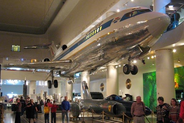 Выходя с лестницы на балкон, оказываешься как раз под потолком зала транспорта. Прямо здесь, у балкона, висит «Боинг-727». В 1994 году его внесли в здание по частям и заново собрали. Но самое удивительное – на этом самолете можно полетать! Сначала, для общего представления, нужно погонять модели самолетиков в маленьких аэродинамических трубах, чтобы понять, как возникает подъемная сила. Дальше в стеклянных ящиках парят аэропланы, управляемые при помощи рычагов. Механика во плоти, не какая-нибудь компьютерная симуляция! Поработав этими рычагами, разбираетесь с принципами работы закрылков и хвостового оперения.