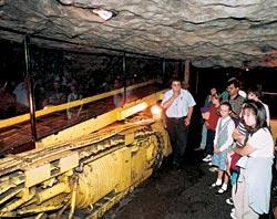 Шахта до сих пор остается одним из любимейших посетителями экспонатов музея. Когда экскурсантов спускают под землю, клеть идет вниз медленно и уходит неглубоко, но возникает иллюзия спуска на 200 метров: стенки ствола шахты сделаны из холста и перематываются в сторону, обратную движению клети. В самом штреке вас перевозят вагонетки. Все как в старину – и безопасная лампа, чье пламя синеет при выделении рудничного газа, и знаменитая клетка с канарейкой (правда, в данном случае – электрической). Так же, как настоящая, искусственная птичка поет, пока в пространство под потолком не попадает этот самый газ – тогда она «теряет сознание» и умолкает. А дети на всю жизнь запоминают, что метан легче воздуха.