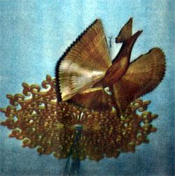 Туловище и голова птицы выточены из тонкослойной сосновой чурки, отсвечивающей янтарем. По бокам с помощью тончайших пластинок-дранок врезаны размашистые крылья. Пышным стрельчатым веером расходится хвост, а головку венчает крошечная корона-хохолок с волнистой золоченой текстурой.