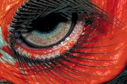 Для птиц зрение – самое главное из чувств, и многие представители пернатых славятся своей зоркостью. Эта способность объясняется тем, что в процессе эволюции птицы, в отличие от млекопитающих, сохранили в сетчатке глаза цветовоспринимающие колбочки. Орел или ворон, скользя беглым взглядом с километровых высот по земле, видят затаившегося грызуна. Однако кафрскому рогатому ворону столь острое зрение ни к чему. 70% светлого времени суток эта крупная южноафриканская птица неспешно бродит по земле в поисках пищи – змей, ящериц, черепах, грызунов, крупных насекомых, падали, плодов и семян. Главный инструмент добытчика – конечно же, глаза. Однако их недолго и повредить, постоянно раздвигая клювом жесткую траву саванны, роясь в земле и кучах слоновьего навоза. Решают проблему безопасности роскошные длинные ресницы, которые в то же время эффектно смотрятся на фоне обширного круга голой ярко-красной кожи.