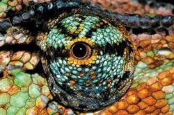 Из всех позвоночных только у этих рептилий глаза могут двигаться независимо друг от друга. Причем размах таких движений очень велик: каждый глаз может поворачиваться в глазнице на 180 градусов по горизонтали и на 90 по вертикали. Один глаз может смотреть вперед и вверх, в то время как другой – назад и в сторону. Следя за добычей, они держат ее в поле зрения одного глаза, а вторым контролируют происходящее вокруг. Эта уникальная особенность позволяет йеменскому (шлемоносному) хамелеону, как и его родичам, обозревать все пространство вокруг себя, не двигаясь и даже не шевеля головой. Такая подвижность требует, чтобы глаз очень сильно выдавался из глазницы, а это грозит ему обсыханием и увеличивает вероятность его повреждений. Хамелеоны решили такую задачу просто: почти всю поверхность их глаза закрывает кольчатое веко, покрытое такой же чешуей, как и вся остальная кожа рептилии. И лишь в центре остается небольшое отверстие, точно соответствующее размеру зрачка.