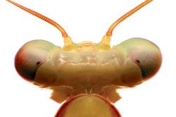 Богомол, живущий в Южной и Юго-Восточной Азии, – одно из тех существ, у которых фасеточные глаза достигают наибольшего совершенства. Огромные, почти сферической формы, они способны обозревать практически все окружающее пространство. Тем не менее его голова (вытянутая по горизонтали, чтобы максимально увеличить расстояние между глазами, облегчая тем самым создание объемного изображения) находится в постоянном движении. При ярком дневном свете каждый омматидий (отдельная фасетка) глаза богомола изолирован от соседних элементов пигментными клетками и воспринимает только свет, падающий прямо на него. Однако в сумерках в некоторых клетках пигмент перемещается таким образом, что боковые стенки омматидиев становятся прозрачными, и зрительные рецепторы могут улавливать свет, прошедший сквозь несколько соседних элементов. Таким образом на слабое освещение глаз богомола отвечает повышением чувствительности.