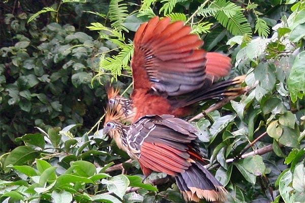 Вообще, всех птиц по типу развития делят на птенцовых и выводковых. Птенцы выводкового типа вылупляются зрячими, в пуху и с первого же часа жизни готовыми следовать за матерью и самостоятельно клевать корм, как цыплята или утята. У птенцовых птиц потомство появляется на свет голым, слепым и абсолютно беспомощным, способным только открывать рот для кормления. Но гоацинов невозможно отнести ни к тому, ни к другому типу: их птенцы рождаются не такими бойкими, как у выводковых птиц, но все же зрячими и покрытыми редким рыжеватым пухом. Если им ничего не угрожает, они недели две смирно сидят в гнезде. Если же какая-нибудь древесная змея или дикая кошка все-таки доберется до гнезда гоацинов, птенцы, которым всего несколько дней от роду, шустро выбираются из гнезда и удирают, карабкаясь по веткам, за которые они хватаются не только ногами, но и... крыльями.