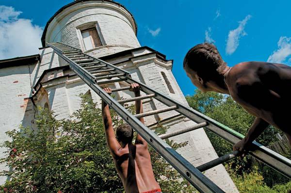 Продираемся сквозь бурьян ко входу в звонницу, пристроенную к собору, – через нее же и вход в храм. Ее первый этаж – примерно на уровне обычного третьего, вверх сквозь широкую арку ведет лестница, густо поросшая сорняками, сквозь которые еще видны осколки мраморных плит. Звонница и собственно собор соединены площадкой-галереей, часть которой обрушилась от времени. Через 8-метровую пропасть кто-то заботливый перекинул пару ненадежных на вид досок. По ту сторону импровизированного моста щербато зияет вход в церковь. «Слышьте, вокругсветы, – дружелюбно суетятся рядом двое деревенских лет 20 в трениках и без маек. – Надо просто быстро пробежать по доскам, и все нормал будет!» Один из них, Юрка, сразу показывает, «как» перебегать.
