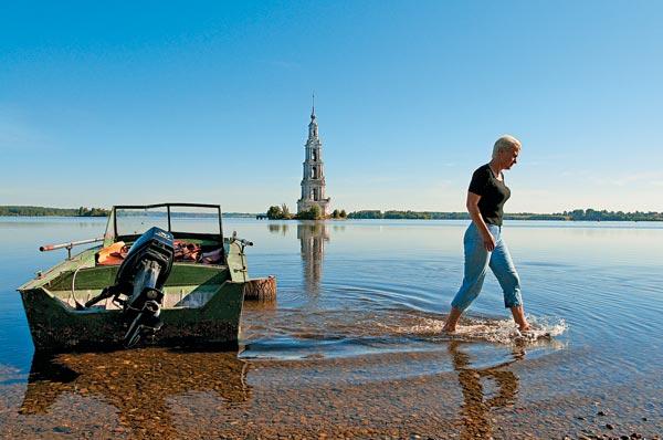 Хорошее шоссе кончилось довольно быстро – как только повернули на калязинскую дорогу, на Большое Михайловское. А просто неплохая дорога вполне ожидаемо перешла в довольно среднюю после пересечения границы Московской области. Впрочем, «лендроверу» пока все было нипочем, он так же бодро мчался на 110. Калязин встретил утренней прохладой и абсолютно пустыми, несмотря на будний день, улицами. Промахнуться мимо самого главного места в городе просто невозможно: вбок от главной трассы, будто разрезав острыми ножницами квартал, спускается к Волге булыжная мостовая, распахивая перед нами знаменитую калязинскую панораму – стоящую в паре сотен метров от берега на крохотном островке колокольню Никольского собора. Вот и все, что осталось от старого Калязина. Старая часть города была затоплена в 1939 году при строительстве Угличской ГЭС. Если мысленно продолжить взглядом улицу, по которой мы спустились к реке, то она упрется ровно в колокольню, выскочившую белым сталагмитом из лаковой поверхности озера. У самого уреза воды, чуть не упираясь носом в булыжники, тихо покачивается одинокая моторка, чем-то загадочно булькая в своих железных недрах.