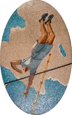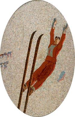 Судя по маленькому размеру самолета, из которого выпрыгнул спортсмен (из ближнего моноплана он сделать этого не мог – парашют уже начал раскрываться, а самолет совсем рядом), он выполняет затяжной прыжок и только-только дернул за кольцо. И если другие мозаики в основном прославляют победы советского человека над силами природы, то эта посвящена прославлению победы «нового» человека в борьбе с самим собой (в данном случае – со своим страхом). Его лицо в напряжении. Выполнение затяжных прыжков в СССР считалось высшим пилотажем.