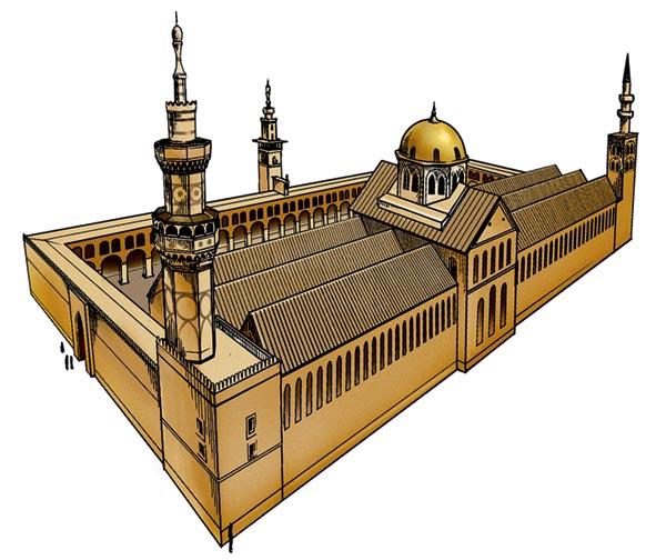 В начальный период распространения ислама в качестве мечетей использовали византийские храмы. Их не разрушали, а приспосабливали, переориентируя на Мекку и пристраивая к основному зданию огромный двор, где могли расположиться все молящиеся. До VIII века образцом такой «конвертации» служила старейшая мечеть Омейядов в Дамаске – бывший храм Иоанна Крестителя (еще раньше там располагался римский храм Юпитера, остатки которого видны с внешней стороны мечети). Однако в VIII веке храм был полностью перестроен, и на его месте появилась новая мечеть, облик которой сегодня считается эталонным. В мечети по-прежнему хранится одна из святынь как мусульманского, так и христианского мира – Глава Иоанна Крестителя, пророка Яхья в исламе.