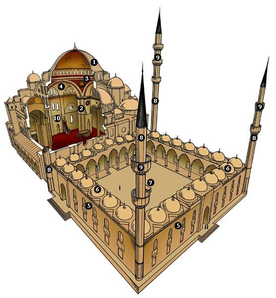 Один из самых распространенных типов мечети в мире – османский. Архитектурная вершина этого стиля – мечеть Сулеймание в Стамбуле, построенная великим зодчим Османской империи Синаном в первой половине XVI века по заказу султана Сулеймана Великолепного (отсюда и название). Османские зодчие наследовали конструктивный принцип византийского храма, прежде всего константинопольской Святой Софии. Как и у нее, (1) купол Сулеймание положен на массивные опорные (2) столбы с помощью (3) «парусов». Вес купола равномерно «гасится» через боковые (4) полукупола. Мечеть украшают знаменитые изразцы из Изника, а также многочисленные светильники и галереи. Двор мечети по перимет ру обрамлен крытой (5) галереей, украшенной (6) малыми куполами. В центре двора расположен (7) фонтан для ритуальных омовений, который сегодня играет декоративную роль (омовения происходят под внешней галереей). По углам внут реннего двора Синан поставил четыре (8) минарета – Сулейман был четвертым правителем империи после переноса столицы в Стамбул. Десять (9) балконов, с которых возглашался призыв на молитву, также в честь Сулеймана – десятого султана из династии Османов. За (10) стеной киблы (кибла – направление на Каабу) стоят усыпальницы султана и его жены Роксоланы.