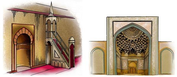 2. Михраб – ниша в стене мечети, указывающая направление на Каабу. К михрабу мусульмане обращаются лицом во время молитвы. Михраб часто украшается по периметру изразцами, резьбой и надписями из Корана и фланкируется двумя полуколоннами. В больших мечетях сооружают несколько михрабов, чтобы один из них всегда был в поле зрения молящегося. Михрабы устраивают и во дворе мечети – для тех, кто опоздал на молитву и вынужден свершать намаз снаружи.