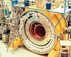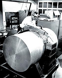 Сборка резонансного детектора AURIGA. Видны торцы трех медных защитных труб, окруженных емкостью для жидкого гелия
