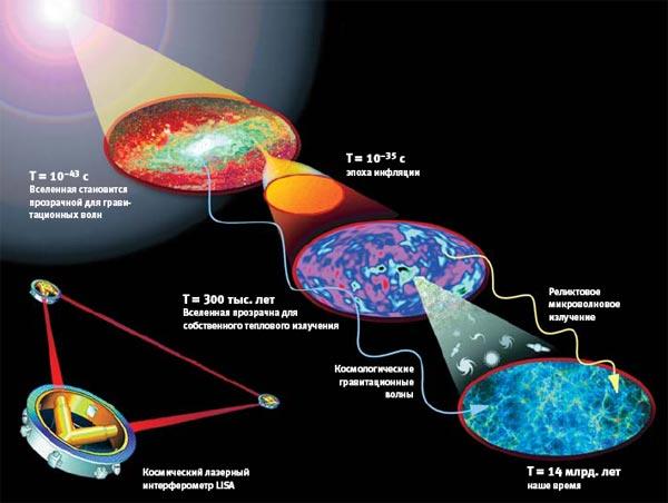 Космологические гравитационные волны испускаются в эпоху ранней Вселенной хаотически движущимися неоднородностями вещества. Это единственный вид излучения, способный донести до нас информацию о первых секундах существования Вселенной.