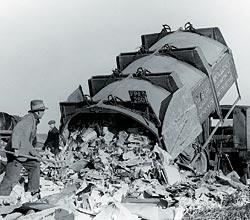 Свалка в графстве Суррей, Великобритания – грузовик выгружает бумажный мусор, работник свалки вручную его разравнивает (1940). Фото: MARY EVANS/VOSTOСK PHOTO