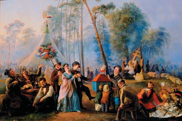 Помимо «самоварниц» на аллеях Сокольнической рощи появлялись разносчики со всевозможной снедью – вареными яйцами, огурцами, ветчиной, соленой рыбой, калеными орехами, хотя большинство москвичей предпочитали еду приносить с собой – так получалось дешевле и сытнее. Дальше по кустам стали ставиться торговые палатки и шалаши со «всевозможными предметами существующего в Сокольниках спроса, от колбасы и пряников до детских игрушек и тросточек включительно».
