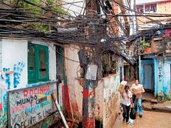 Росинья – крупнейшая фавела Рио (100 000 жителей). Там есть даже гостиница и банк, а в каждый дом проведено бесплатное электричество (как – показано на фотографии). Но общее впечатление от нее все равно удручающее