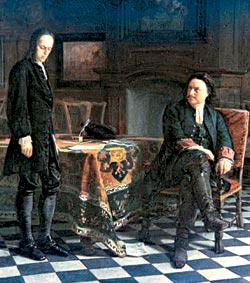 К 1870 году после неблагосклонно принятых публикой картин на религиозные темы Николай Николаевич Ге (1831—1894) возвращается из Италии в Петербург и обращается в своем творчестве к истории. Картина «Петр I допрашивает царевича Алексея в Петергофе» была представлена на первой выставке передвижников в 1871 году и вызвала оживленную полемику в прессе. Переводчик А.М. Салтыков писал в те дни: «Всякий, кто видел эти две простые фигуры, должен будет сознаться, что он был свидетелем одной из тех потрясающих драм, которые никогда не изглаживаются из памяти». Художник помещает отца и сына в петергофский дворец Монплезир, хотя на самом деле их последняя встреча произошла в Кремле. Но более важны не интерьеры, а суть воссозданной сцены: несостоявшийся наследник трона виновен, Петр же – прав, об этом свидетельствует композиция картины, позы и взгляды героев. Император Александр III заказал художнику копию картины для себя, что Ге и сделал. Ныне один вариант знаменитого полотна хранится в Русском музее в Петербурге, а другой – в Третьяковской галерее. Игорь Христофоров, кандидат исторических наук