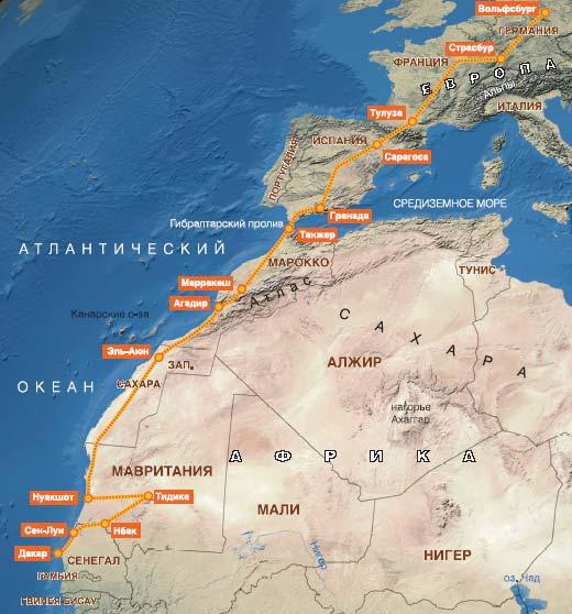 А оно – задание – и вправду было. И его суть, а также географические масштабы во многом объясняли боевой дух путешествующих: десять человек – пятеро немцев, четверо русских и один итальянец – завершали последний, тринадцатый, этап кругосветного ралли на «Туарегах», задуманного компаний «Фольксваген», и решали единственную задачу – ехать там, где ехать нельзя. Им следовало по бездорожью пересечь Сенегал, Мавританию, Марокко, перебраться через Гибралтар (на пароме, конечно), проехать Испанию, Францию, Германию, то есть проплыть по пескам, по кромке Атлантики, пройти по каньонам, камням, горам, чтобы в конце концов убедиться в том что «Туарег» – это танк и лимузин в одном флаконе. Что без поправки так и оказалось.