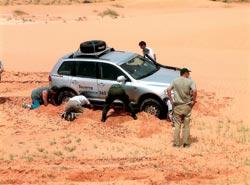 После каньона начались барханы, которые скрывались по другую сторону горного хребта. Удивительно, оказывается, песчаные пирамиды бывают разных цветов, даже если находятся в непосредственной близости друг от друга. Рядом с белым барханом может возвышаться рыжий, а по соседству с рыжим – почти розовый. И это – не игра света. Цвет песка действительно разный. Поначалу команда довольно бойко «скачет» по пескам, пока путь не упирается в пересохшее русло реки. Три первых автомобиля его благополучно переезжают, а под четвертым – песок проседает, в колею невесть откуда набегает вода, и «Туарег» мягко и плавно начинает куда-то погружаться. Ну а дальше все происходит, как в кино: лопаты, трос и быстро действующие люди.