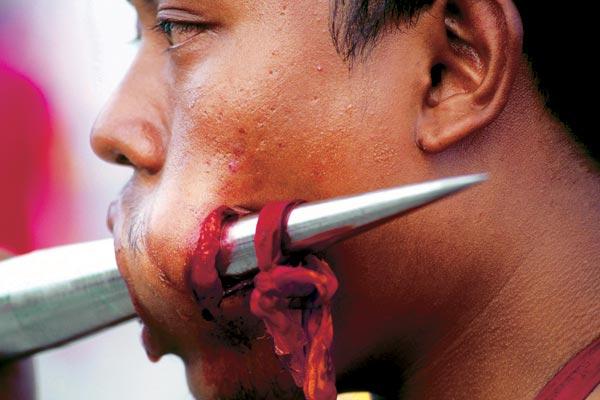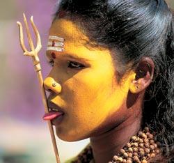 Перфорация языка трезубцем, воплощающим огненную стихию Шивы, – часть аскетической практики верующих. Женщина идет в храм Самайяпурам (штат Тамилнад, Индия), чтобы почтить богиню Мариамман