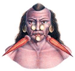 У большинства южноамериканских индейцев существовал обычай делать отверстия в самых разных частях лица, но чаще всего в носу, ушах и нижней губе. В дырочки продевали деревянные или бамбуковые палочки, свернутые листья, а в торжественных случаях – полые косточки маленькой птички с протянутыми сквозь них перьями. Иногда в нижнюю губу вставляли крупную втулку из дерева, смолы, камня или металла.