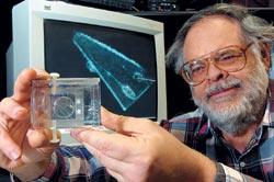 Джордж Флинн, руководитель международной научной группы по исследованию доставленных «Стардастом» материалов, держит в руках капсулу, в которой кусочки аэрогеля с образцами кометного вещества пересылаются между лабораториями
