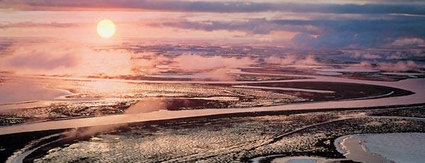 Многие тысячи лет Лена несет к океану ил, песок и мелкую гальку. Все это, оседая на дне моря Лаптевых, образует обширную дельту площадью 32 000 км2 – одну из крупнейших в мире. Относительно теплая ленская вода, впадая в море, повышает температуру всего полярного бассейна, оказывает влияние на флору и фауну побережья, и именно от нее зависит существование вблизи Новосибирских островов Великой Сибирской полыньи. Организованный в 1985 году Усть-Ленский заповедник взял под охрану два участка: Дельтовый, который охватывает северо-западную часть дельты, и Сокол – на северной оконечности Хараулахского хребта.