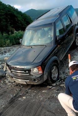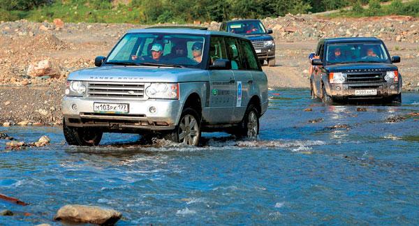 Разумеется, настоящая внедорожная экспедиция немыслима без форсирования водных преград. И преграду эту нам предоставили устроители пробега, соорудив съезд в горную речку с нелегким названием Мзымта, обозначив в ней вешками брод. Казалось бы, ну, подумаешь, проехать по воде, не достающей даже до нижних кромок дверей? Однако на деле все оказалось сложнее. Дно реки выложено скользкими камнями, быстрое течение то и дело их перекатывает, машина буквально пляшет по ним: «Осторожнее с газом, – советует инструктор, – выроешь колею, и следующие не проедут». Замечание несколько запоздало, мы уже почувствовали, что электроника системы Terrain Response не успевает справляться со скользкими валунами – чуть больше газ, чуть резче поворот руля, и машина проседает, закапываясь в непрочное дно. Интересно, а что будет, если эту систему отключить? Увы, такой эксперимент в рамки пробега не входил.