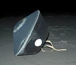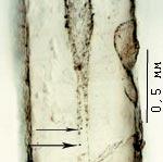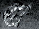 Самые крупные из пойманных кометных частиц образовали в аэрогеле треки длиной до 2 см и шириной 0,5 см, напоминающие по форме кормовую свеклу – турнепс. Широкая часть трека сформирована многочисленными слабо связанными мелкими пылинками, которые разлетаются во все стороны в момент столкновения с аэрогелем. А длинный «корень» образуют относительно крупные каменные частицы в центре пылинки (отмечены стрелками)