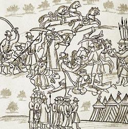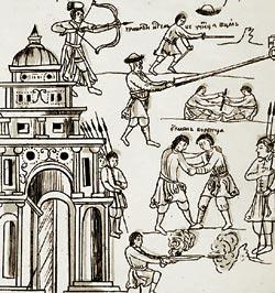 Обучение Ермака: «Бог Ермаку… дал силу, счастье и храбрость смолоду». Надписи: «Ермак борется», «Ермак стреляет» и другие. Из «Ремезовской летописи» (конец XVII века)