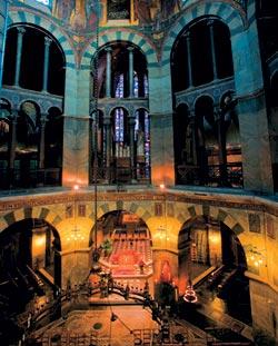 Очевидно, что такие сооружения воздвигаются не по одной лишь практической необходимости. Во всяком случае, на момент постройки собор был непомерно велик для крошечного деревянного городка, каким был в то время Ахен. Главная задача такого сооружения – символическая, и эту великую церковь следует рассматривать как своего рода политический трактат. Так, с античных времен восьмигранник считался знаком земного совершенства. В верхней части он переходит в круг – символ совершенства уже небесного и божественного. Иными словами, вся конструкция намекает и напоминает о совершенном, свыше установленном порядке, к которому обязан приуготовлять свой народ земной властитель, – в том и состоит его функция.